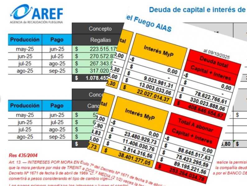 Ante la solicitud de información elevada por Radio Fueguina, la Agencia de Recaudación Fueguina (AREF), entregó las cifras de la deuda de Roch hasta el pasado 9 de octubre: 408.646.654,67 pesos en concepto de regalías y 253.264.034,78 pesos en carácter de canon FyV. Un total de casi 662 millones de pesos, suficientes para alterar los ánimos de cualquier negociación.