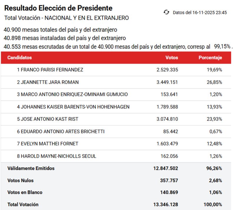 Con el 99,1% de las mesas escrutadas, la postulante oficialista alcanzaba el 26,85 por ciento de los votos, mientras que Kast llegaba al 23.93. En tanto, en tercer lugar se ubicó Franco Parisi, del Partido de la Gente, con 19.69 por ciento de los votos.