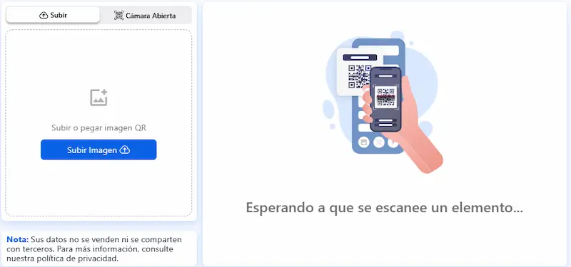 - Sube la imagen desde tu dispositivo o arrástrala y suéltala, o también puedes apuntar la cámara directamente al código QR para escanearlo.