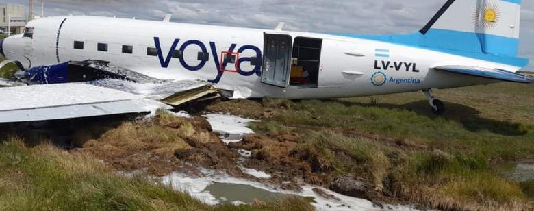 El Basler BT-67 matrícula LV-VYL, sufrió este lunes una excursión de pista (como se llama al despiste en la jerga aeronáutica) en el Aeropuerto Internacional Ramón Trejo Noel durante un vuelo de entrenamiento.