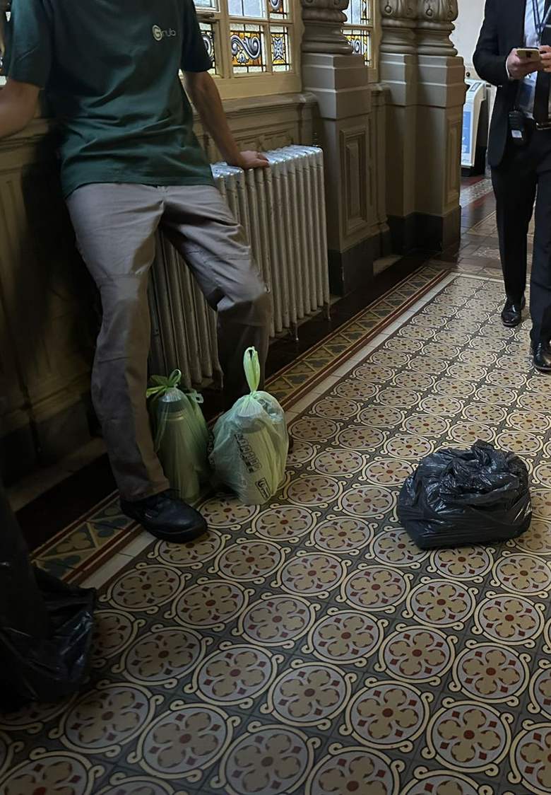 Fotos de las supuestas pertenencias de la senadora López, en bolsas de basura, en un pasillo del Congreso.