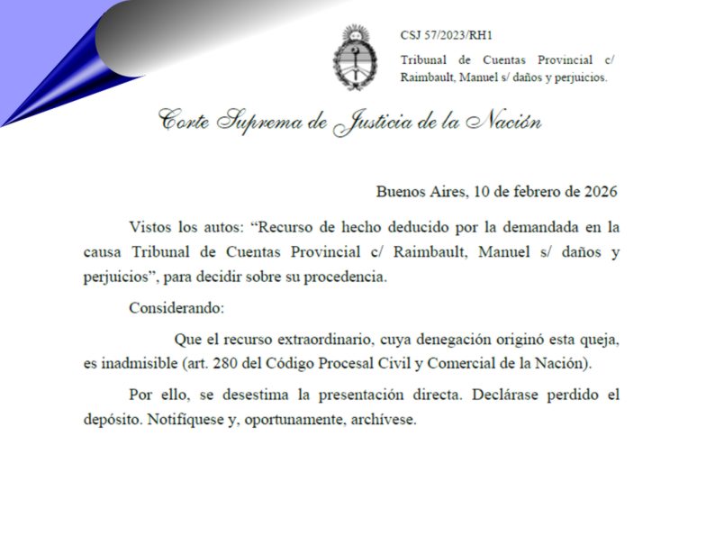La Corte Suprema de Justicia de la Nación rechazó el recurso de queja presentado por Manuel Raimbault y dejó firme el juicio de responsabilidad patrimonial que deberá afrontar el exvicegobernador de Tierra del Fuego, quien integró la fórmula de gobierno de Fabiana Ríos.