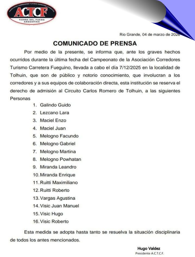 La justicia rechazó una medida cautelar solicitada por un grupo de personas incluidas en un listado de la Asistencia de Corredores de Turismo Carretera Fueguino (ACTCF) que aplicará el derecho de admisión en futuras competencias, tras los incidentes ocurridos en diciembre de 2025 en el autódromo de Tolhuin, informó el abogado Sebastián Marchisio, representante legal de Gabriel Melonio, Facundo Melonio, Martina Melonio, Pouhatan Melonio y Agustina Vargas.
