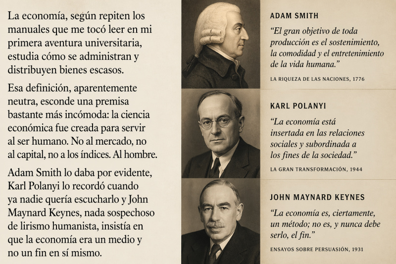 La economía, según repiten los manuales que me tocó leer en mi primera aventura universitaria, estudia cómo se administran y distribuyen bienes escasos. Esa definición, aparentemente neutra, esconde una premisa bastante más incómoda: la ciencia económica fue creada para servir al ser humano. No al mercado, no al capital, no a los índices. Al hombre. Adam Smith lo daba por evidente, Karl Polanyi lo recordó cuando ya nadie quería escucharlo y John Maynard Keynes, nada sospechoso de lirismo humanista, insistía en que la economía era un medio y no un fin en sí mismo.