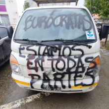Aparecieron en calle Moyano. Pintaron un camión del gremio y la fachada del edificio. Son las mismas pintadas que aparecieron ayer en la torre del CAP.
