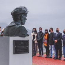 La semana de la Antártida concluyó con un acto protocolar en el Paseo de los Pioneros Fueguinos, con el rompehielos Almirante Irízar de fondo.