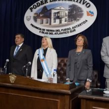 La gobernadora efectuó un extenso repaso de los tres años que lleva de gestión. Reforzó el pacto político con Vuoto y Queno y endureció su pelea con Melella. Críticas al gobierno nacional.
